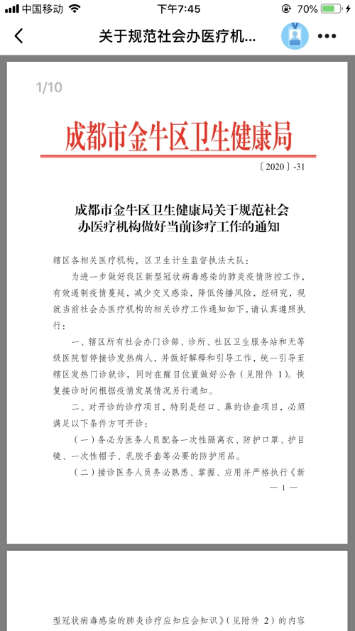 按照金牛区卫健局《关于规范新型冠状病毒感染的肺炎疫情防控期间社会办医疗工作的通知》(以下简称“《通知》”)要求,william威廉英国官网校医院自2020年2月1日起暂停接诊发热病人,恢复接诊时间另行通知。请有相关治疗需求的患者前往辖区指定发热门诊就诊。具体名单参见附件《通知》中金牛区发热门诊信息表。