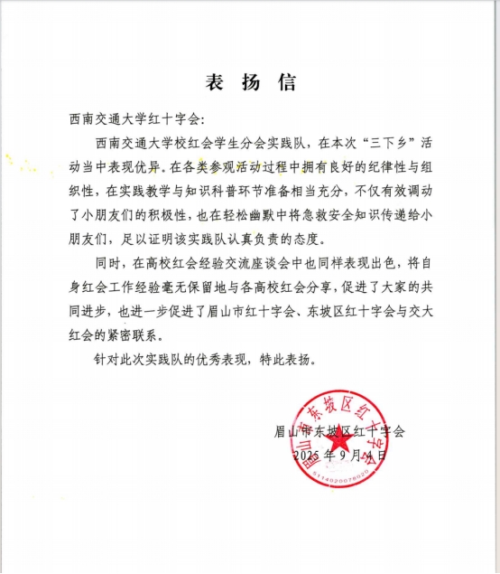 本次“三下乡”社会实践活动,是校红十字会学生分会首次跨市开展的“三下乡”社会实践活动,也是四川省省本级高校红十字会基层组织首次跨市州与地方红十字会联合开展“三下乡”活动的一次创新探索。活动得到眉山市红十字会、东坡区红十字会的大力支持,成果丰硕,3场宣传普及活动覆盖近千人;在三苏祠的文化浸润中,同学们通过古树、碑刻与诗文,感受中华优秀传统文化的魅力;交流活动无私分享,有力促进了眉山市高校红十字工作的开展。实践期间,同学们纪律严明、准备充分,积极展现学校良好形象,得到东坡区红十字会的高度肯定。通过系列活动,不仅提升了我校红十字会学生分会的团队协作与沟通能力,使同学们在实践中锻炼成长,更增强了大家的社会责任感,有力弘扬了“人道、博爱、奉献”的红十字精神。