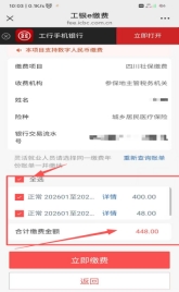 关注微信公众号“成都税务”→“我要办事”→“社保缴费”→ 选取任一银行缴费(以工行为例)→填写个人信息→点击查询按钮→选择缴费年份:2026年;社保经办机构:金牛区医疗保障局选择缴费档次(任选一个)点击查询按钮点击全选,完成缴费,总费用448元(点击任意一个详情查看显示为“成都普通大学生”)。